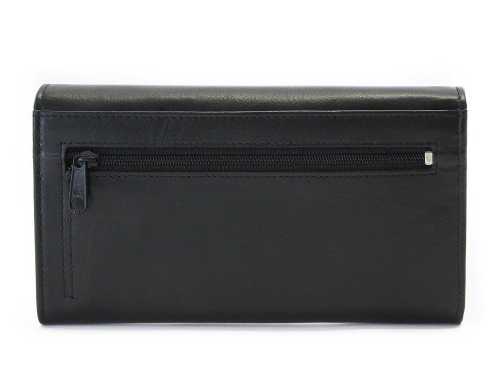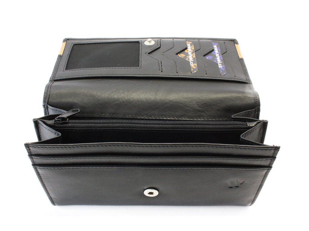Kožená dámská klopová peněženka obsahuje 2 přihrádky na bankovky, zipovou kapsu na mince, 5 kapes na kreditní karty, 1 průhlednou kapsu a 2 otevřené kapsy. Na zadní vnější straně se nachází 1 otevřená a 1 zipová kapsa. Dodáváme v dárkové krabičce.
