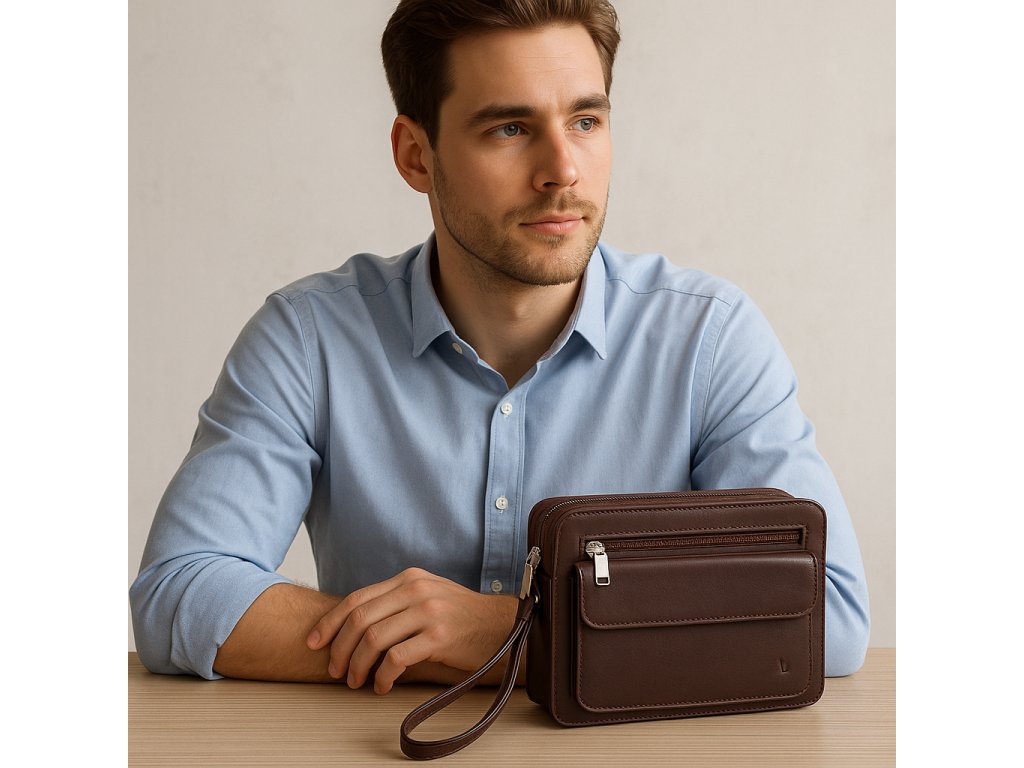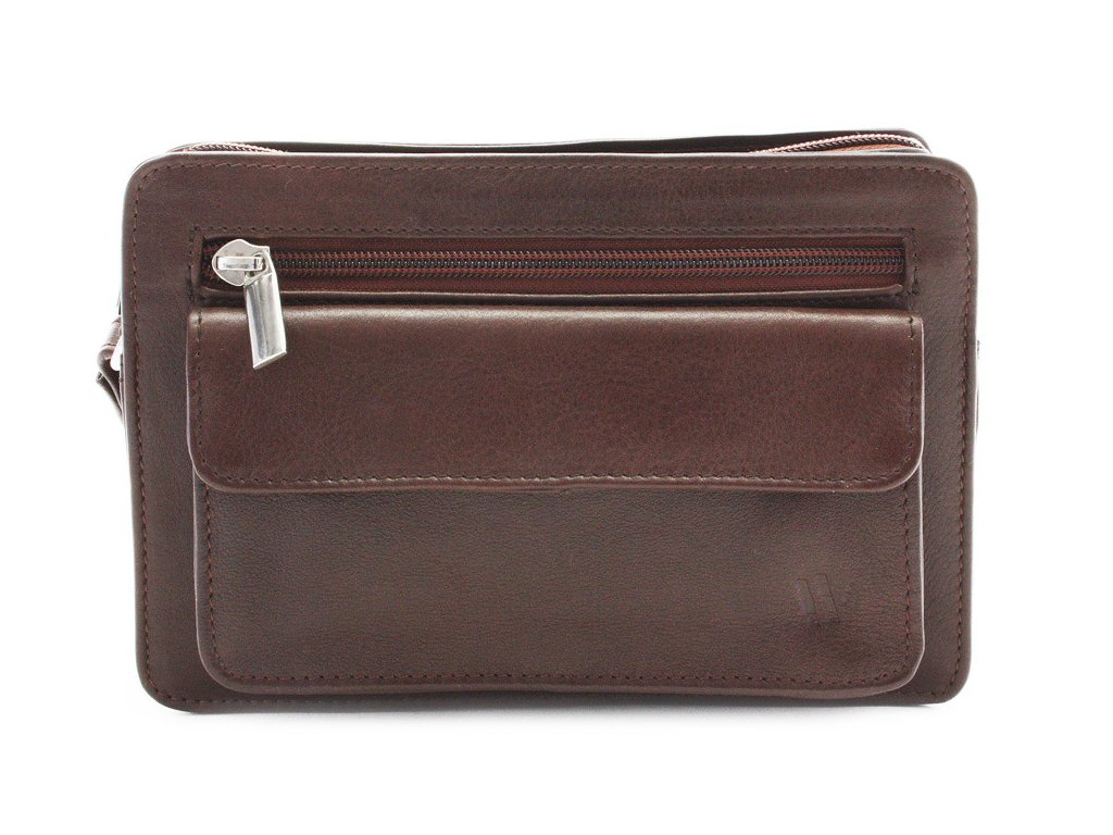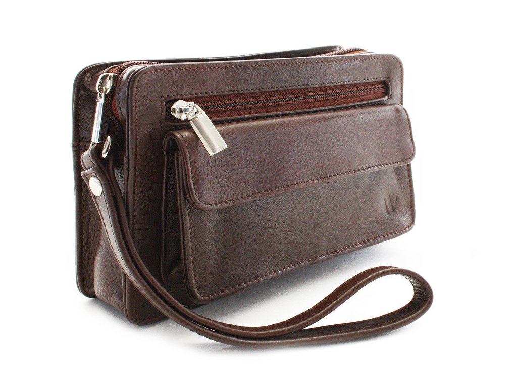 Pánská kožená etue má hlavní prostor chráněný zipem. Na přední vnější straně se nachází 1 zipová a 1 klopová kapsa, na zadní vnější straně je také zipová kapsa. Součástí etue je poutko na zápěstí.
